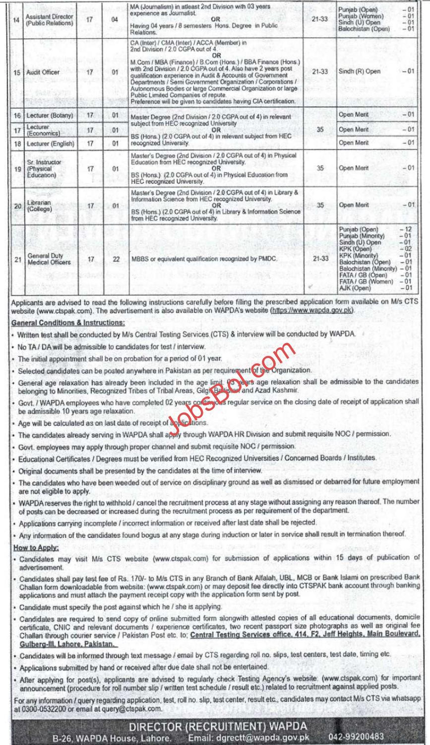 Water and Power Development Authority Jobs Positions are such as Deputy Managers (Accounts & Finance), Assistant Executive Engineers (Civil), Assistant Executive Engineers (Electrical), Assistant Executive Engineers (Mechanical), Assistant Executive Engineers (Electronics), Junior Geologists, Junior Seismologists / Geophysicist, Assistant Directors (Public Relations), Audit Officer, Lecturer (Botany), Lecturer (Economics), Lecturer (English), Assistant Directors (Environment), Assistant Directors (Social Development), Assistant Directors (HR & Admin), Assistant Directors (Legal & Litigation), Assistant Directors (IT / MIS), Assistant Director (Computer Operations), Senior Instructor (Physical Education), Librarian (College), General Duty Medical Officers.